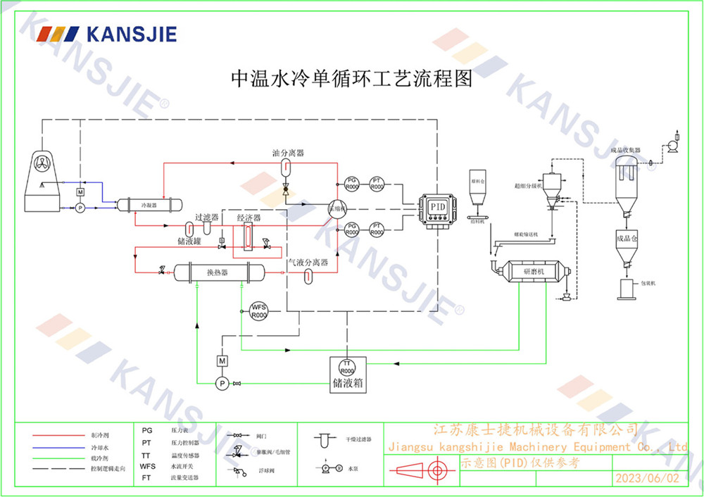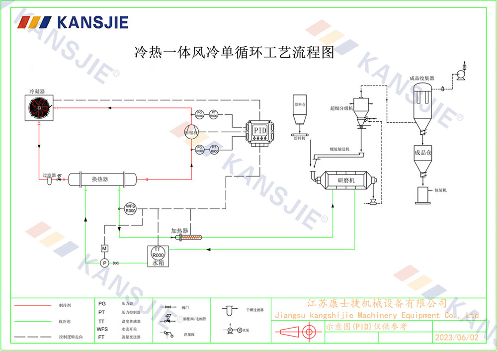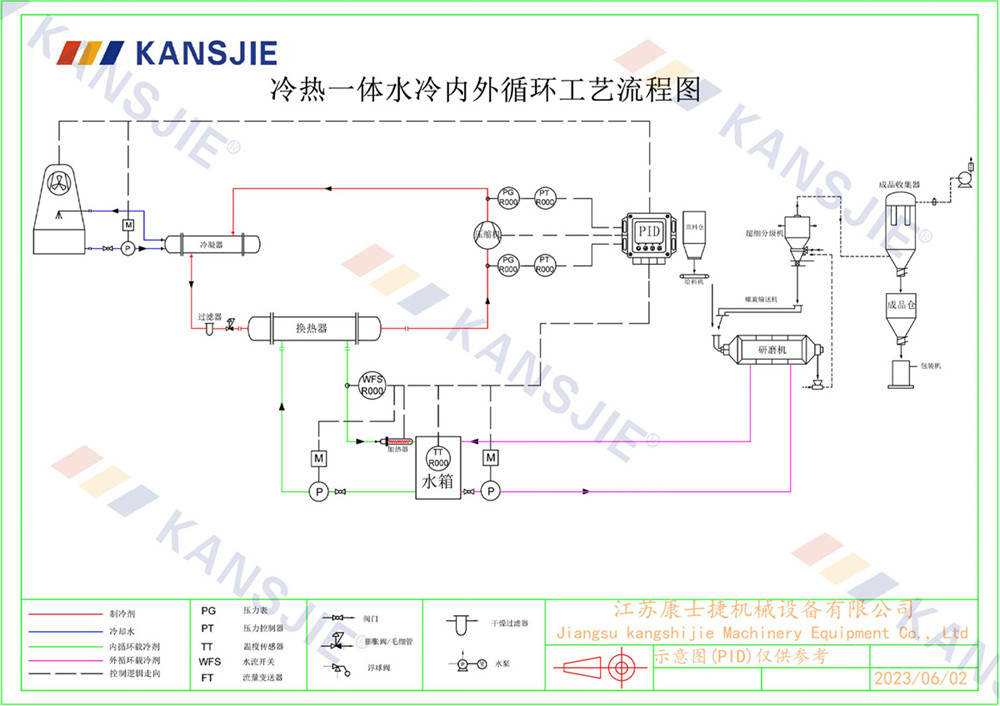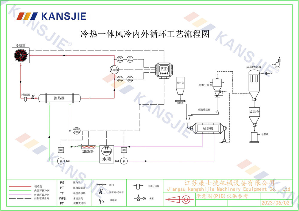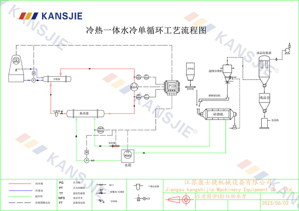 1、冷水機通過製冷係統將水冷卻到一定溫度,然後通過循環係統將冷卻水輸送到研磨(mó)機中。