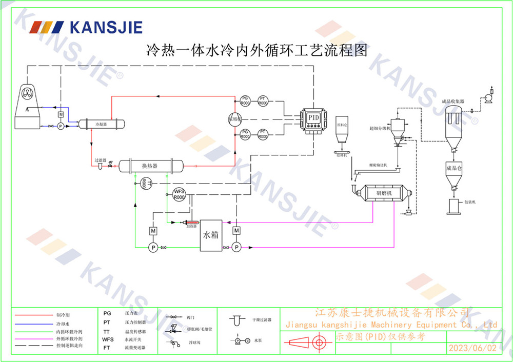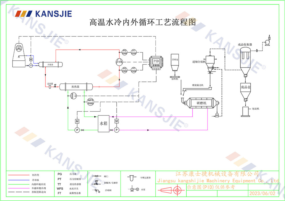 3、冷(lěng)卻水經過研磨(mó)機的出口流出,返回冷水機進行再次冷卻,然後再次輸送到研磨(mó)機(jī)中(zhōng),形成循環。